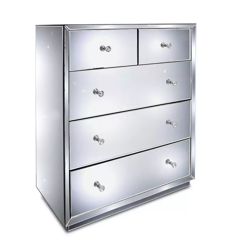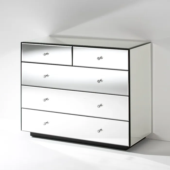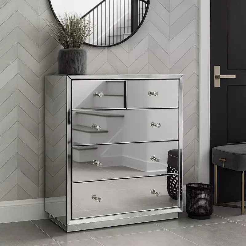 Minimaliste et chic, cette commode 5 tiroirs design miroir Khiva (81 cm) capte l’attention par son esthétique élégante et réfléchissante. Recouverte de panneaux de particules entièrement plaqués de façades miroir biseautées (sauf à l’arrière), elle injecte une grande luminosité et beaucoup de clarté dans votre intérieur, tout en soulignant les lignes contemporaines de votre pièce. Le design épuré s’accorde aisément avec divers styles, du moderne au classique revisité.