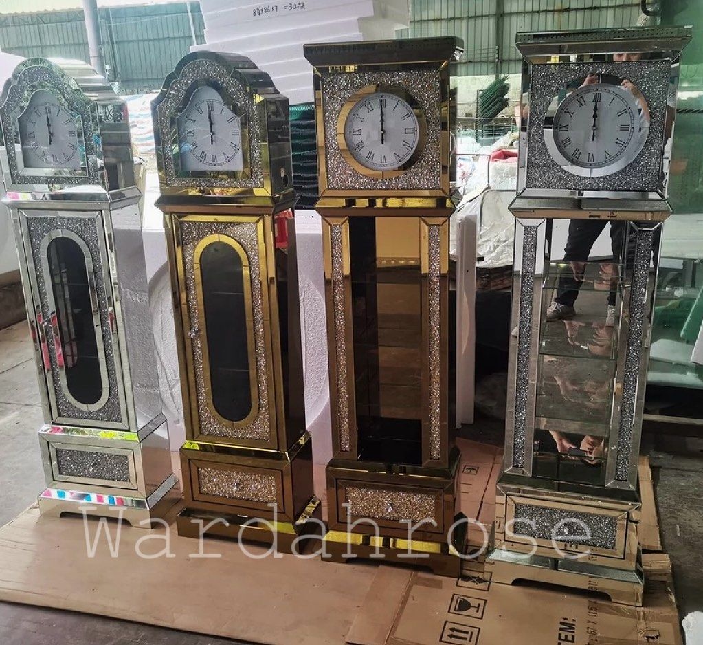Conçue pour impressionner, cette horloge combine un cadre en MDF robuste, des surfaces miroir scintillantes, et des incrustations de diamants acryliques écrasés qui captent magnifiquement la lumière.