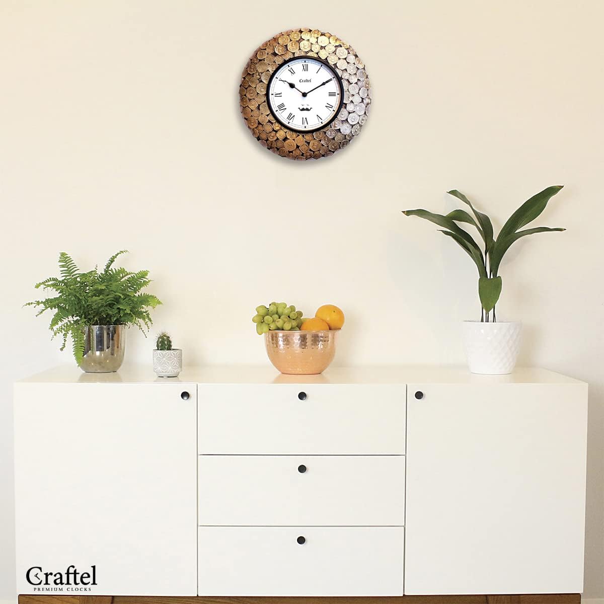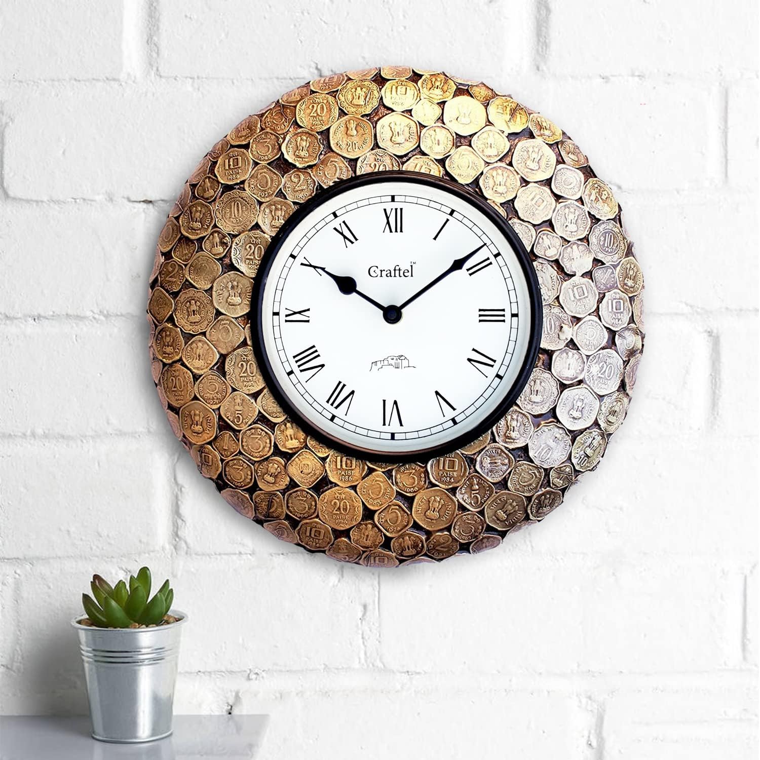 Horloge Murale Décorative Vintage – Doré avec Cadran Romain et Pièces de Monnaie en Laiton