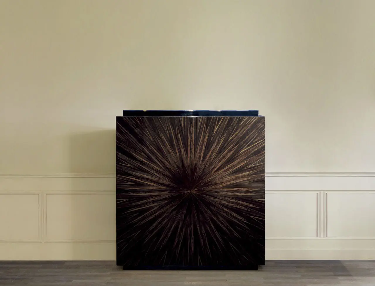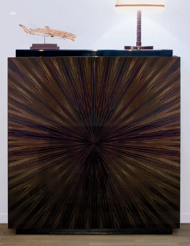 Le cabinet Garrison incarne l’élégance et le savoir-faire artisanal à travers un design sophistiqué en véritable Makassar d’ébène. Ses deux portes sont soigneusement plaquées selon un procédé manuel de haute précision, créant un motif radial spectaculaire qui reflète la lumière et sublime les nuances naturelles de l’ébène. Chaque détail témoigne d’une qualité exceptionnelle et d’un style intemporel.